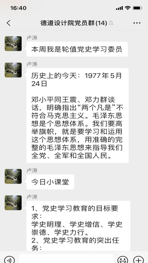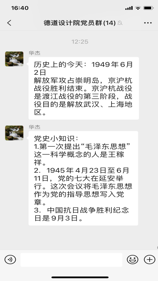 近日,為提升學(xué)史學(xué)習(xí)教育的實效性,設(shè)計院支部創(chuàng)新思路,結(jié)合工作的特殊性,以“黨員學(xué)習(xí)群”為載體,開展“輪值學(xué)習(xí)委員領(lǐng)學(xué)”活動,排出學(xué)習(xí)委員輪值表,支部委員帶頭,黨員跟上,每周由一名“學(xué)習(xí)委員”,帶領(lǐng)大家開展黨史線上學(xué)習(xí)。輪值學(xué)習(xí)委員在值班日當(dāng)天利用中午時間,通過微信群,“敲黑板、劃重點”,發(fā)布“歷史上的今天”和“今日小課堂”兩個版塊的學(xué)習(xí)內(nèi)容?!皻v史上的今天”展示了中國共產(chǎn)黨和新中國成立以來重大事件?!敖袢招≌n堂”每日推送三條黨史學(xué)習(xí)教育內(nèi)容,讓支部每個黨員在靈活時間內(nèi)完成學(xué)習(xí),汲取知識。