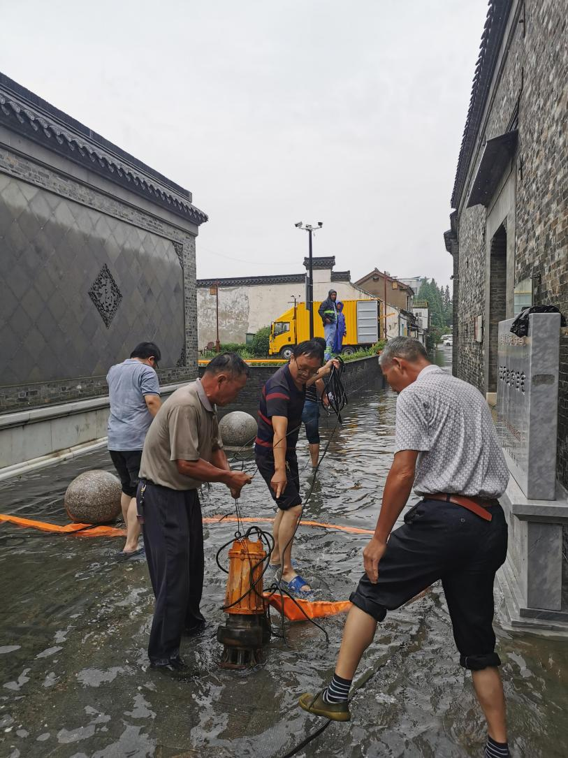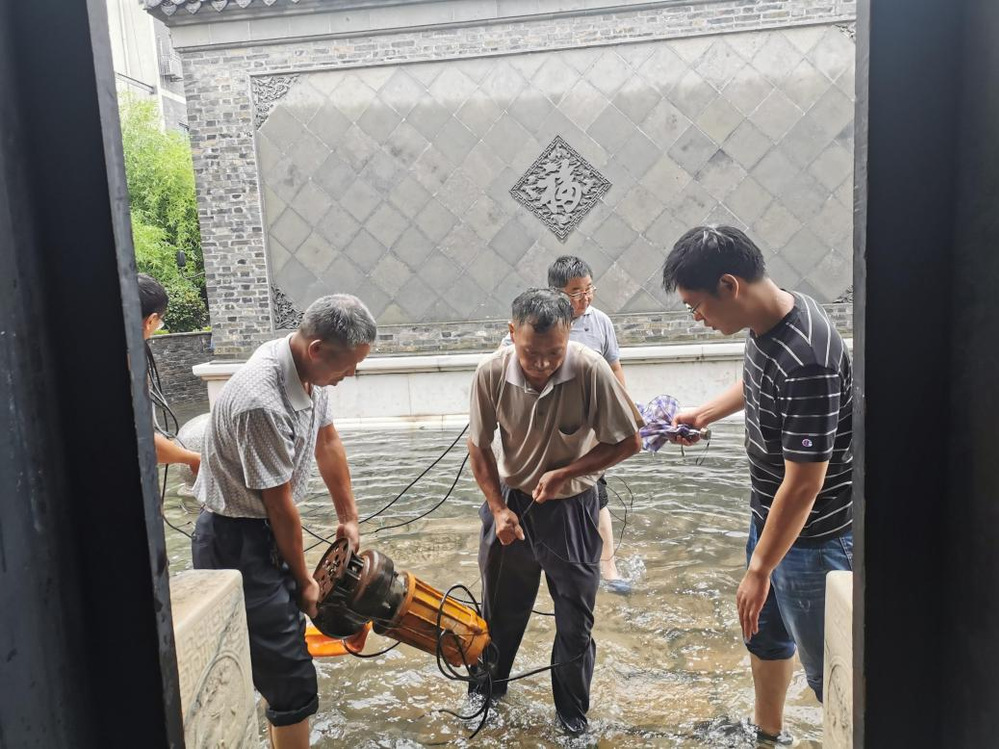 經(jīng)排查發(fā)現(xiàn)緊鄰國家級文物保護單位汪氏鹽商住宅周邊的南河下、省級文保單位蔚圃南側(cè)的風箱巷出現(xiàn)嚴重積水情況,公司第一時間組織工作人員,攜帶抽水泵等設(shè)備進行抽水,最大程度降低暴雨對古宅的影響,確保國有資產(chǎn)的安全。
