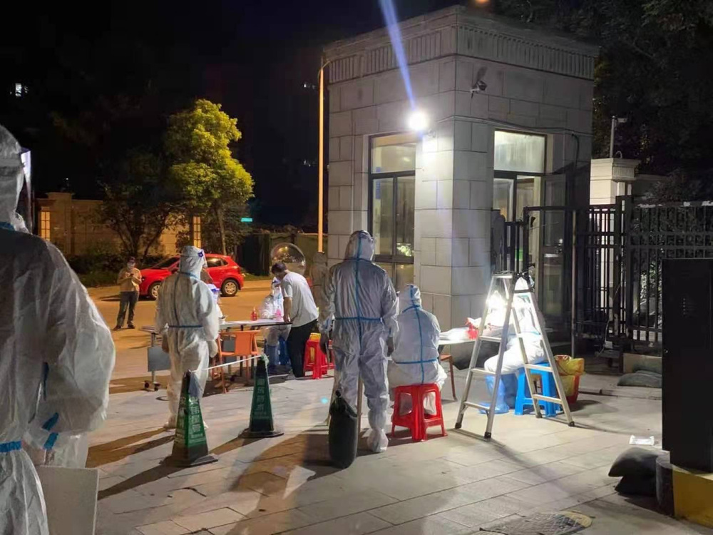 同時(shí),小區(qū)內(nèi)的物業(yè)工作人員在白天做好物資派送的同時(shí),又全力協(xié)助社區(qū)連夜做好了南區(qū)第三次核酸檢測(cè)、信息登記、測(cè)量體溫、維持好現(xiàn)場(chǎng)秩序,提醒業(yè)主做好個(gè)人防護(hù),保持一米距離排好隊(duì)伍,確保業(yè)主安全完成檢測(cè)。