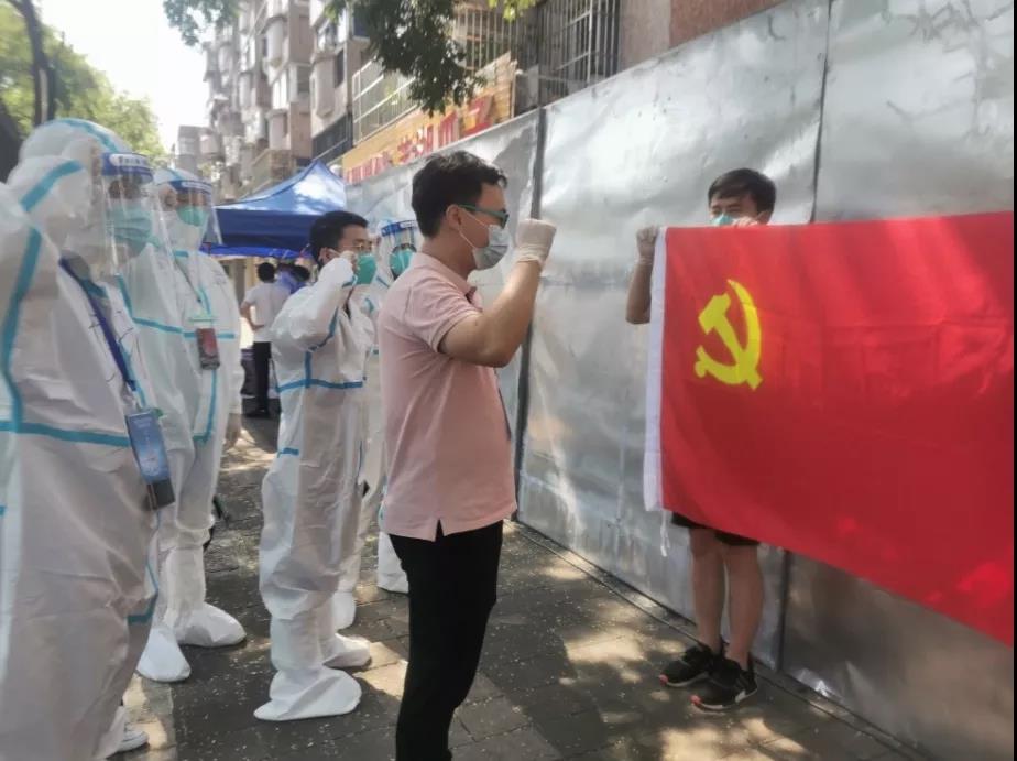 為更好地在抗疫一線發(fā)揮基層黨組織的戰(zhàn)斗力和黨員的先鋒模范作用,8月8日,第一批次出征高風險地區(qū)——武塘社區(qū)的志愿服務先鋒部隊經集團黨委批準,率先成立了抗疫志愿服務行動臨時黨支部,讓黨旗第一時間飄揚在疫情防控第一線。