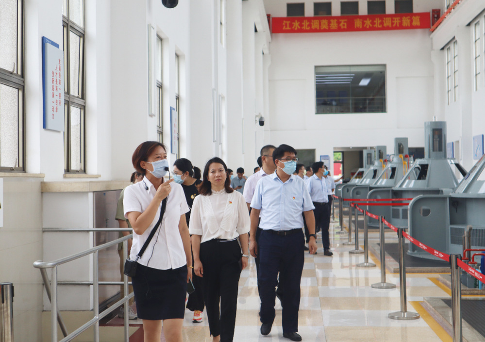 隨后大家走進江都水利樞紐第四抽水站,四站高大雄偉,是4座抽水站中規(guī)模最大的一座。四站的西面入口的上方,“江淮明珠”四個大字,金光閃閃!通過實地參觀學習以及講解員的詳細介紹,大家了解了江都水利樞紐工程歷經(jīng)17年建設和50多年運行情況,進一步深化南水北調工程的重大意義和重要作用。
