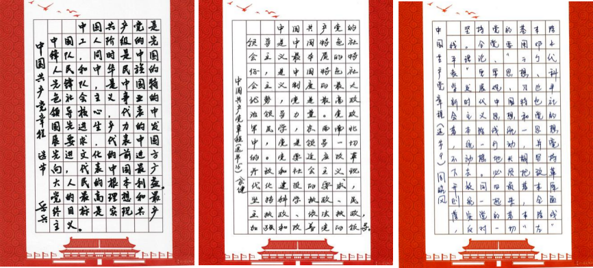 文字入手、意識入腦、責(zé)任入心。支部黨員利用工作之余,以《中國共產(chǎn)黨章程(修正案)》為藍(lán)本,堅持一筆一畫工整書寫黨章,一字一句銘記黨章條款,熟悉掌握黨章主要內(nèi)容,深入領(lǐng)會黨章內(nèi)涵、精神實質(zhì)以及對共產(chǎn)黨員的職責(zé)要求。全體黨員抄黨章、學(xué)黨章、悟黨章,內(nèi)外一心,共同在抄寫中提升黨性,鑄造黨魂。
