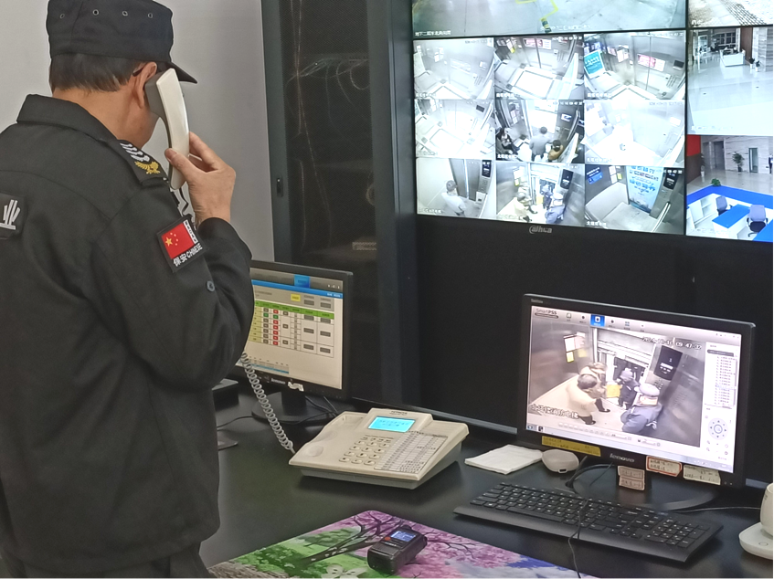 演練開始,乘坐人員進入電梯轎廂,由于突發(fā)情況造成電梯困人事故。監(jiān)控室接到求救電話,在確定被困人員的被困位置、被困人數(shù)、人員情況等,立即啟動緊急救援程序。