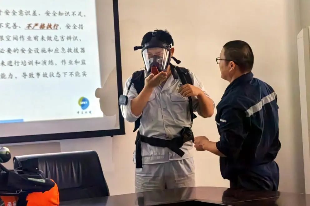 除了理論知識的講解,培訓還增加了安全防護設施的穿戴實操環(huán)節(jié),員工們親身體驗了正壓式空氣呼吸器的穿戴和使用。通過實操學習,員工們不僅掌握了正確的穿戴方法,還深刻體會到了安全防護設施在保障人身安全方面的重要作用。