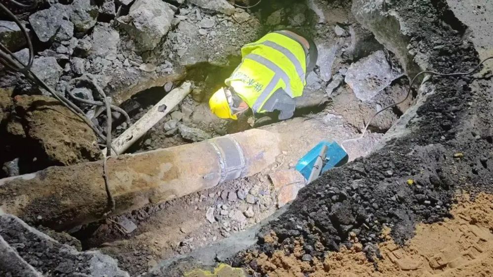 初冬季節(jié),此時晚上室外氣溫在5度左右。挖掘好深達2米的深坑后,工作人員開始實施堵漏。這次漏損點是鋼管變形造成焊縫斷裂達5厘米,由于地下管線異常復雜,有強電纜、還有弱電電纜交叉,有些地方搶修人員只能用鐵鍬或徒手清理出管道維修口。損壞管道清理出來后,發(fā)現(xiàn)只能用焊接修復的方法進行維修,再次增加了搶修的難度及時長,但搶修人員沒有后退,穩(wěn)扎穩(wěn)打,立即進行切割、補縫焊接,最終經(jīng)過6個小時的不懈努力,受損管道于夜里11點之前成功修復,供水恢復正常。