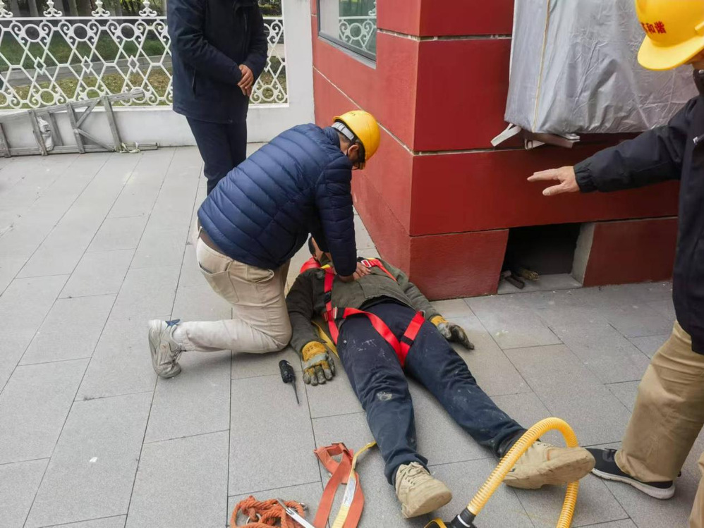 本次演練模擬石油新村供暖小區(qū)半通行地溝內(nèi)供暖管道泄漏,供熱公司第三方維保單位1名作業(yè)人員進(jìn)入半通行地溝進(jìn)行施工,作業(yè)人員因長(zhǎng)管呼吸器被工具擠壓導(dǎo)致窒息暈倒,監(jiān)護(hù)人員同步立即報(bào)警并上報(bào)事故,隨即應(yīng)急指揮小組立即啟動(dòng)應(yīng)急預(yù)案,組織力量開(kāi)展有限空間應(yīng)急救援行動(dòng)。
