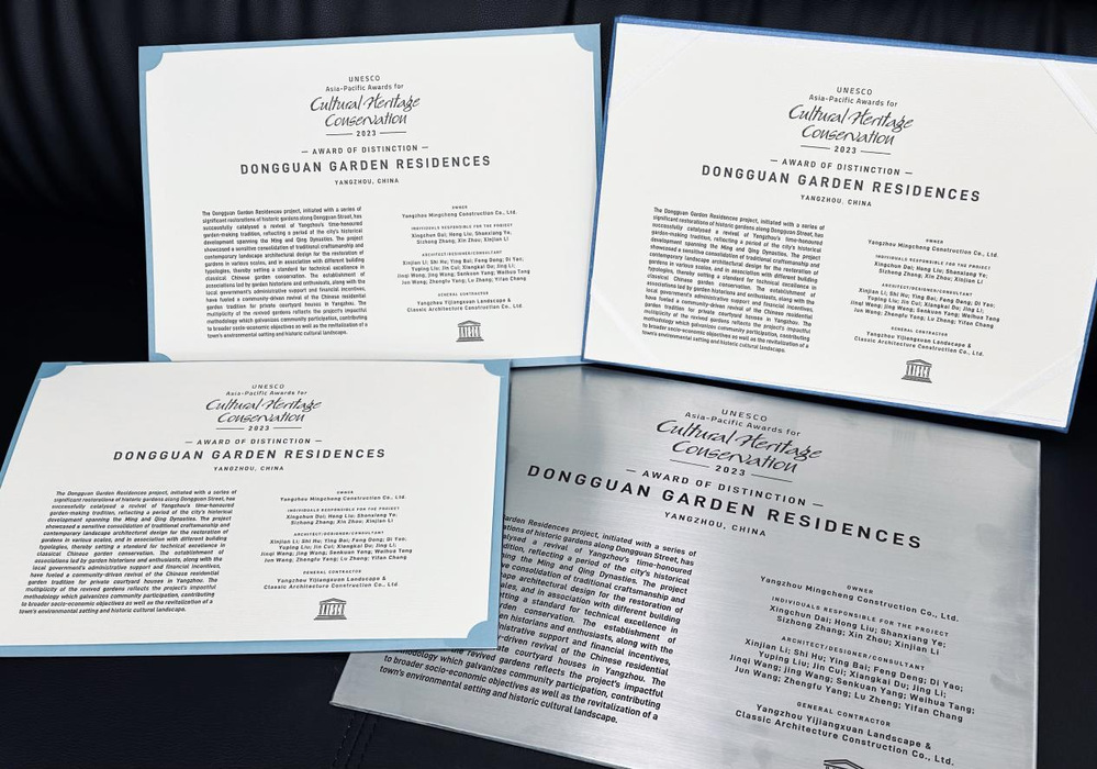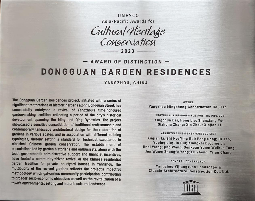 亞太文化遺產(chǎn)保護獎是由聯(lián)合國教科文組織發(fā)起的區(qū)域性獎項,旨在表彰亞太地區(qū)個人及公私部門在保護或恢復區(qū)域具有遺產(chǎn)價值的建筑、場所和不動產(chǎn)方面取得的成就,以鼓勵個人參與及公私合作,保護本地區(qū)的文化遺產(chǎn),造福今世后代。2023年12月21日,揚州城控集團申報的“揚州東關街園宅保護與傳承復興項目”從亞太地區(qū)8個國家48個參賽項目中脫穎而出,斬獲聯(lián)合國教科文組“2023年度亞太文化遺產(chǎn)保護獎杰出獎”,是中國唯一獲得“杰出獎”的文保項目。聯(lián)合國教科文組織在項目評審語中寫到“東關歷史文化街區(qū)是傳統(tǒng)文化與當代景觀設計的完美結合,為亞太地區(qū)古典園林保護及活化利用提供了重要參考”。