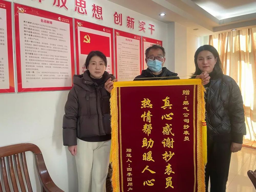 2月24日,揚州市區(qū)四季園小區(qū)天然氣用戶睢先生將一面印有“真心感謝抄表員 熱情幫助暖人心”的錦旗送到了揚州中燃公司,對客服部抄表員郭蘭及時救助獨居老人的善行義舉表示衷心感謝。