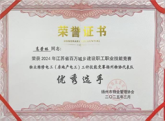 維修電工(房地產(chǎn)電工)工種技能競(jìng)賽“優(yōu)秀選手 ”,高榮林同志,憑借出色的工作技能,在省級(jí)競(jìng)賽“江蘇省百萬城鄉(xiāng)建設(shè)職工職業(yè)技能競(jìng)賽物業(yè)維修電工(房地產(chǎn)電工)工種技能競(jìng)賽”中榮獲“優(yōu)秀選手 ”稱號(hào)。這一榮譽(yù)稱號(hào),不僅是對(duì)該名員工個(gè)人能力的認(rèn)可,更是對(duì)城建物業(yè)在員工培養(yǎng)與團(tuán)隊(duì)建設(shè)方面的肯定。