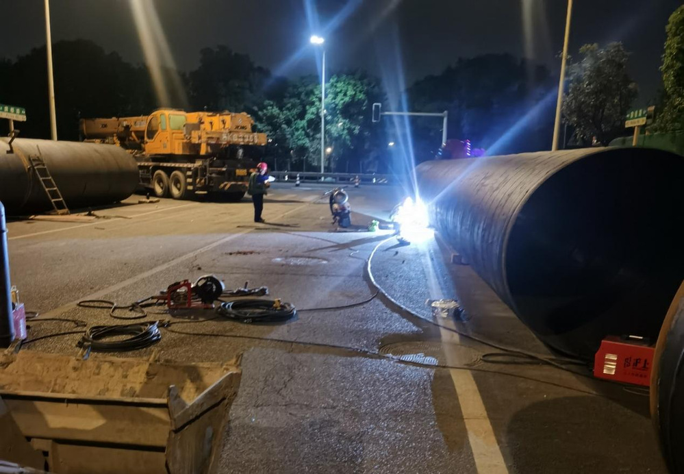 在管道焊接環(huán)節(jié),本項目DN1800污水管道采用雙管敷設(shè),DN2000鋼套管內(nèi)嵌DN1800污水管,創(chuàng)新采用“地面預(yù)制+整體吊裝”工藝,將15米雙管在地面焊接成型后,由兩臺50噸吊車協(xié)同作業(yè)精準(zhǔn)下放。為確保零滲漏,項目團隊在雙管間隙注入高壓水泥漿,形成雙重密封,噴淋系統(tǒng)、霧炮車全天候抑塵,基坑積水即時抽排,有力實現(xiàn)了揚塵不擴散、泥水不外流。