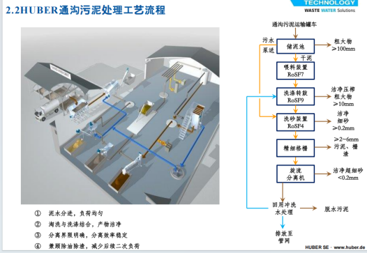 處理設(shè)備采用固體分類和固液分離技術(shù),通過洗滌轉(zhuǎn)鼓裝置與洗砂裝置的協(xié)同作業(yè),將通溝污泥中的粗大物質(zhì)、細(xì)砂及砂粒有效分離。其中,粗大物質(zhì)被輸送至垃圾處理設(shè)施,細(xì)砂得以回收再利用;濾出的污水則經(jīng)過精細(xì)過濾裝置和旋流分離一體化裝置的進(jìn)一步處理后,排放至污水處理廠。整套流程實(shí)現(xiàn)了通溝污泥的減量化、穩(wěn)定化、無害化和資源化。