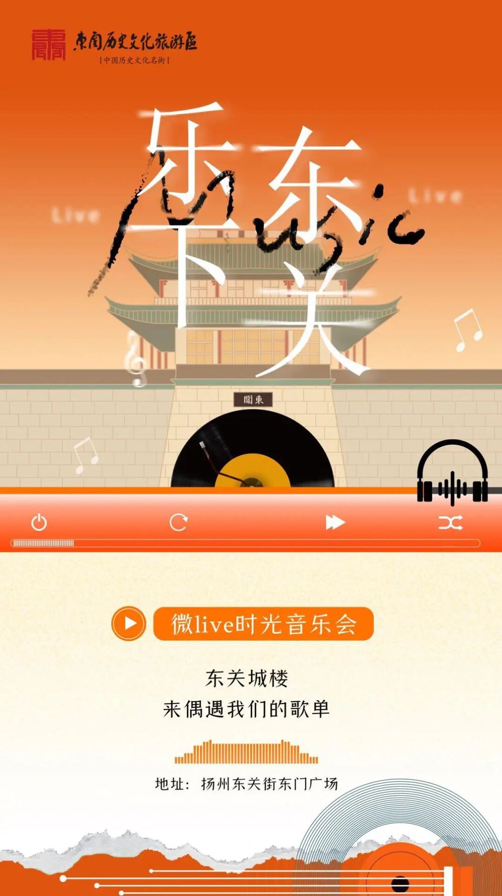 揚州東關街,這座承載著千年歷史的文旅名片,青磚黛瓦間流淌著廣陵古城的煙火與韻味。為進一步挖掘其文旅潛力,推動音樂藝術與古城文化深度融合,響應文旅產(chǎn)業(yè)高質(zhì)量發(fā)展需求,推動古城夜經(jīng)濟,揚州市名城建設有限公司擬舉辦 “樂下東關” 微 Live 時光音樂會,讓千年城墻下響起 “流動的樂章”,為市民與游客帶來全新的文化體驗。