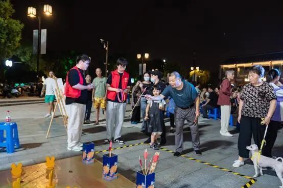 除了文化雅韻,現(xiàn)場(chǎng)設(shè)置了多個(gè)互動(dòng)打卡與市集體驗(yàn)區(qū),讓節(jié)日氛圍更添煙火氣?!拔以谛炷拊铝痢贝蚩c(diǎn)前,居民手持造型精巧的月亮小夜燈定格溫馨瞬間;“玉兔投壺”游戲區(qū)排起長(zhǎng)隊(duì),老少同樂(lè)間復(fù)刻古代士人的閑情雅趣。“月光市集”匯集文創(chuàng)手作、中秋美食等,市民憑游園卡完成互動(dòng)、集齊印章,即可兌換月亮小夜燈和冰皮月餅,將節(jié)日祝?;饔|手可及的溫暖。